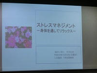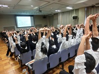 「私達の身の回りには、様々なストレッサー(ストレスの原因:人間関係のトラブル、勉強の悩み等)があり、それによってストレス反応(イライラや気持ちの不安定、頭痛や疲労等)が起きてしまう。そのため、上手くストレス対処をしていかなければならない。」という講演の後に、ストレスマネジメント体験として、呼吸法や身体的リラクゼーションを全員で行いました。生徒達は、お腹の膨らみを意識しながらゆっくりと呼吸をしたり、身体に力を入れた後に脱力したりすることで、ストレスを解消できることを学びました。