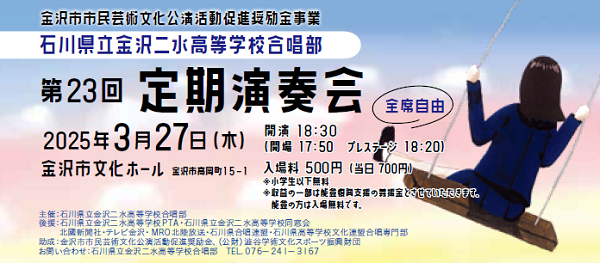 3月27日㈭18:30~(プレステージ18:20~)金沢市文化ホールにおいて石川県立金沢二水高等学校合唱部第23回定期演奏会を開催する運びとなりました。令和6年能登半島地震・豪雨で被災した皆様の少しでも役に立てるように、演奏会当日は募金箱を設置し、チケット収入やOBOG協賛金の一部と合わせて義援金を送る予定です。また被災された方で演奏会観覧希望の方がいらっしゃれば、無料でご招待いたしますので、下記申込よりぜひご応募ください。今回は県内高校で音楽教諭としてご活躍中の本校合唱部50期卒業生、宮腰たまみ先生(旧姓:黒川)を客演指揮としてお招きし、広くOBOGを募って合同ステージを設ける予定で、OBOGの方もまだまだ募集中なので1曲からでもステージでご一緒できる方は今月中に申し込みをお願いします。チケットは500円(当日700円)で販売しておりますので、本校部員から購入するか、下記に必要事項を記入していただければ対応いたします。たくさんのご来場お待ちしています!