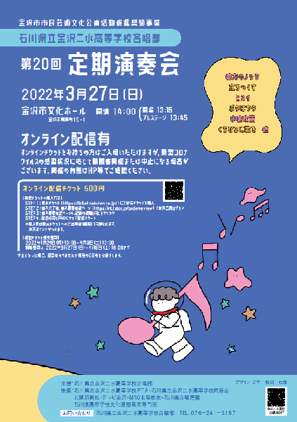 来月3月27日(日)14:00~金沢市文化ホールにて石川県立金沢二水高等学校合唱部第20回定期演奏会を開催予定です。13:15開場、13:45~プレステージとして夏の声楽コンクール上位入賞者による独唱披露が行われます。また、前顧問である外泰子先生を客演指揮としてお招きし、石川県立金沢辰巳丘高等学校合唱部の皆さんと、コロナ禍で定期演奏会の舞台に立てなかった72期、73期と現役メンバーで合同ステージを設ける予定です。ただし感染状況によっては無観客開催(オンライン配信のみ)、客演ステージ中止、もしくは演奏会そのものが中止となる場合もございます。日が近づきましたらこちらのHPにて詳細を告知する予定です。年度末のご多忙な時期ではございますが、部員一同、心よりご来場をお待ちしています。遠方の方でもぜひオンライン配信をご覧ください。