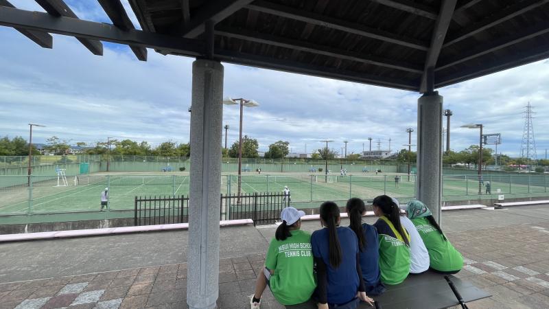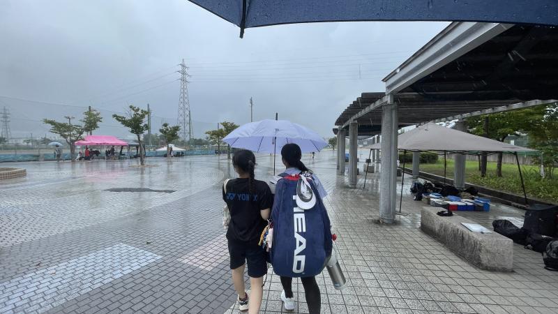台風が接近しており、不安な気持ちで当日朝を迎えました。小雨は降るものの風はなく、予定通りの日程で練習試合を行うことができました。9月後半には新人大会があり、雨の降る中での試合も予想されます。今回、雨の中でオムニコート(人工芝に砂を散りばめたコート)で試合を行えたことは、大きな経験となりました。どのような環境の中でもベストなプレーができるように、今後もたくさんの経験を積んでいこうと思います。