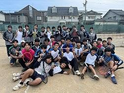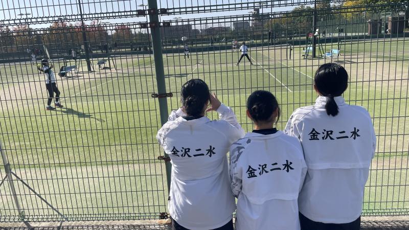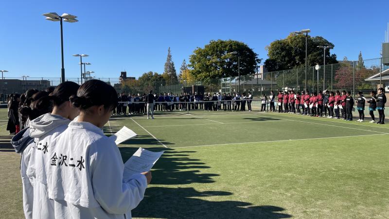 会場は津幡公園テニスコート。加納高校は男女合わせて25名で来県するということで、今回は二水高校も男女で同じ会場で試合を行いました。さらに石川工業高等専門学校の女子生徒2名も参加し、ダブルスの試合では二水女子と高専女子がペアを組み、試合を回しました。 シングルス・ダブルスともに競る展開が多かったのですが、粘り強くボールを返したり、スマッシュを決めたりと、いままでの練習の成果を出すことができました。最後には全員での記念撮影も行い、三校の仲が深められました。