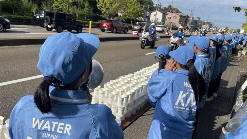 生徒たちは水を配りながら「がんばってください!」とランナーに呼びかけ、ランナーの方からも「水ありがとう!」と感謝の言葉をいただくことができました。ランナーの方におもてなしの心をもって接することができ、良い経験となりました。