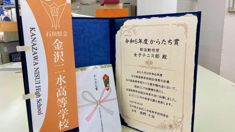 団体戦で県総体優勝、北信越3位、全国大会出場と輝かしい成績を残してくれた3年生。その成績が認められ、卒業式前日に行われたからたち賞授与式において、女子テニス部がからたち賞を受賞することができました。また、石田さんも個人で受賞しました。テニスの技術も高く、後輩たちにも優しく接してくれた3年生はいなくなりますが、現部長を中心に楽しく、厳しくテニスに取り組んでいこうと思います。