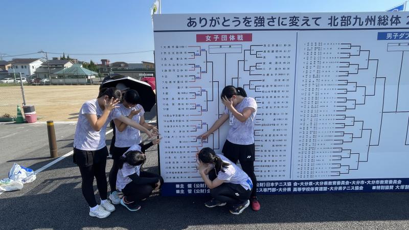 いよいよ団体戦試合当日!一回戦の相手は地元の大分県の杵築高校。アウェーの中でしたが、しっかりとラケットが振れており、ダブルス・シングルス1,シングルス2のすべてで勝利!!
