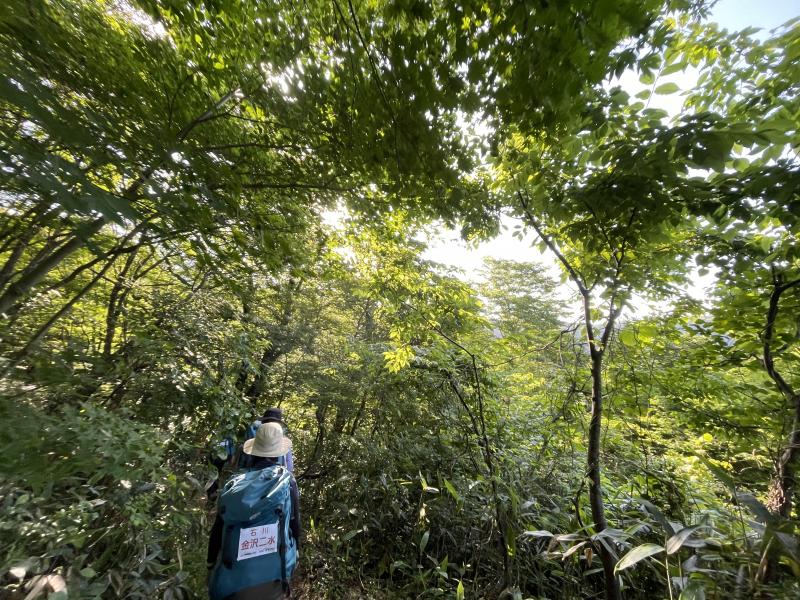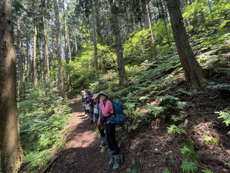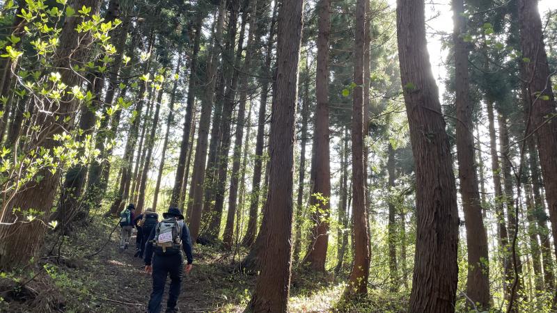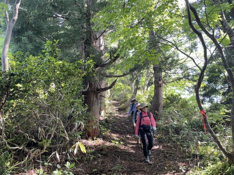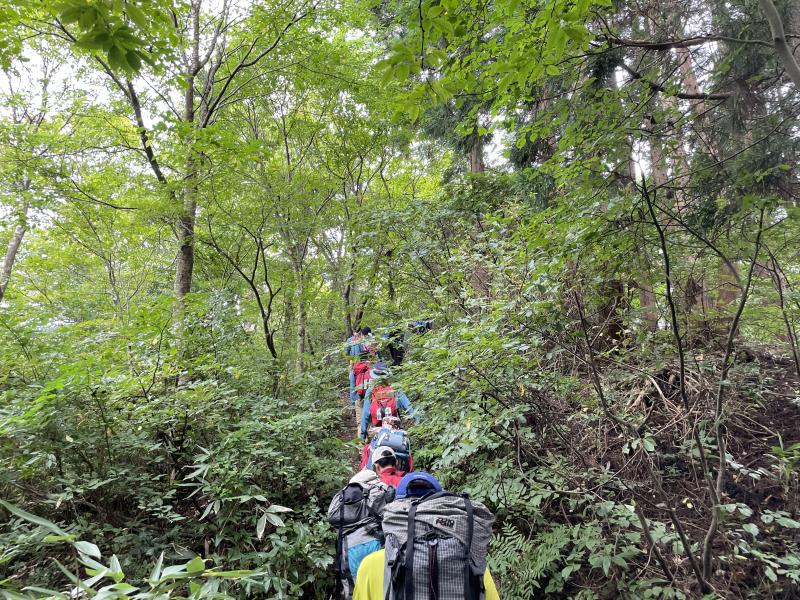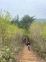 前日の雨で日陰の部分はぬかるみがあり、今年の大雪で倒木が多くなっていました。途中でお会いした登山者の方と「あっちの道は〇〇だから気をつけて」、「ここは冬には木のてっぺんまで雪があったんだよ」と交流をしながらゆったりと登山することができました。今回は1年生2名が初参加しましたが、先輩に遅れることなく、景色を楽しみながら登りきることができました。