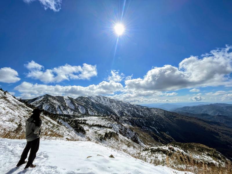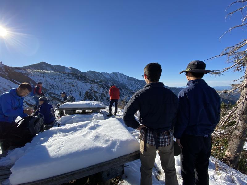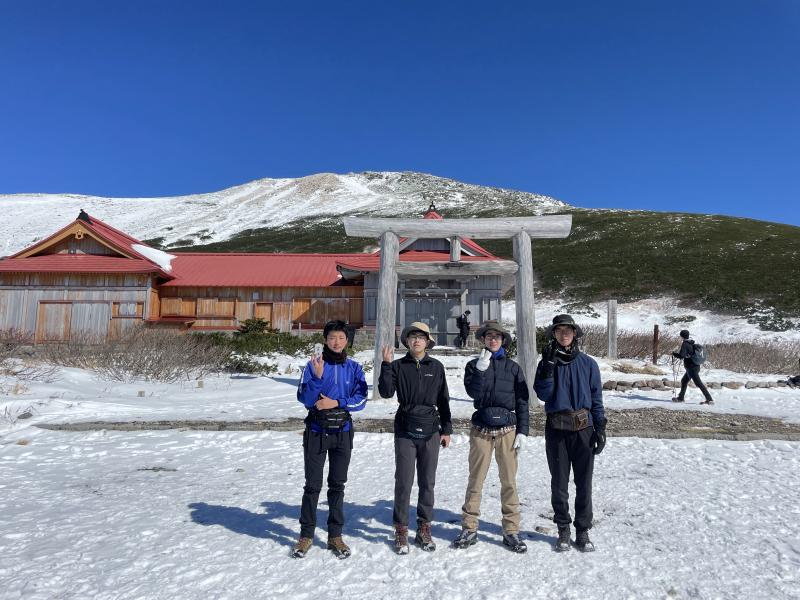 初冠雪の報道から1週間たっていたため、「雪の状況次第では途中で引き返す」と確認した後、登山開始。見事な秋晴れで登山者も多く、道中では「高校生か、がんばっているね」と声をかけていただくことが多数ありました。