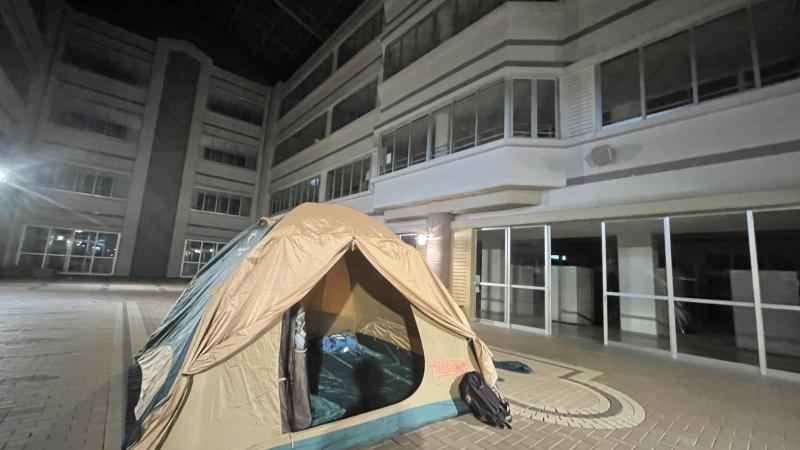 さて、新型コロナウイルに対して様々な機関で規制が緩和されてきており、石川県高等学校体育連盟登山専門部の方でも規制緩和の方向に進んでおります。その1つとして登山合宿における宿泊についての緩和がありました。緩和に伴い本校でも4月よりテント泊の練習を開始しました。4月7、8日、14、15日、21、22日に学校内のガレリアにテントを張り一夜を過ごしました。回数を重ねるごとに炊事やテント内の整理整頓などの手際がよくなっており、生徒も自信をつけていました。