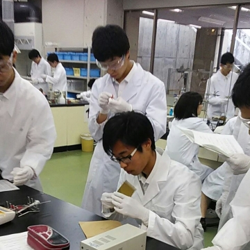 物理部の参加した導電性高分子の実験では化学的に生成した導電性高分子について、温度、電気等の物理特性を測定しました。高校の分野としては化学と物理の2科目を横断した実験であるうえ、高価な材料や貴重な実験器具を使用できたこと、そして金沢工業大学の先生や学生から、非常に手厚い指導をしていただき、生徒は満足した様子でした。