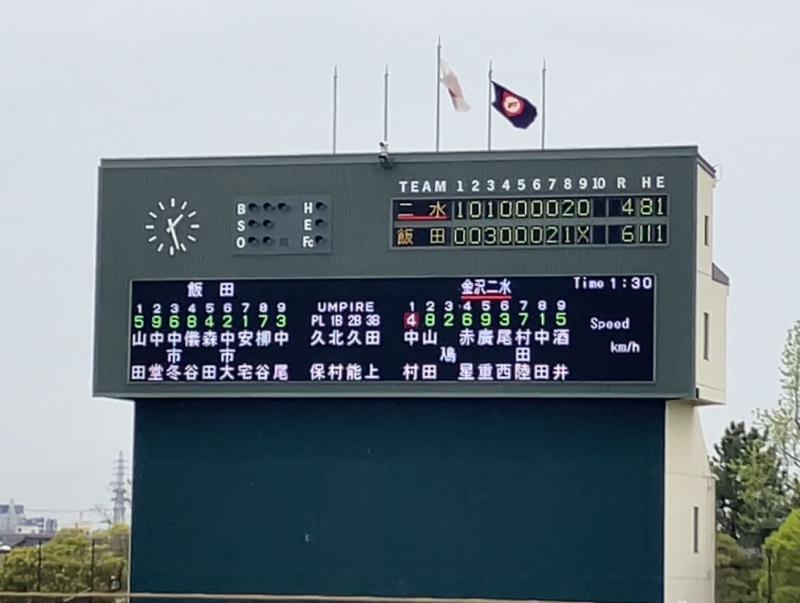 試合が動いたのは2回二水の攻撃、死球で出塁したランナーを2年生が手堅く繋ぎ、2本の安打で1点を先制。尚も2死2,3塁のチャンスで1年生がチームに火をつける2塁打を放ち、さらに2点の追加点かという場面だったが、正確な飯田の中継プレーが成立し2点目を阻止されてしまった。(2-0)2回以降は両校の先発投手が意地の投げ合いを見せ、7回まで0が並んだ。特に、二水先発投手は7回まで飯田打線を2安打に抑え、打線を完全にシャットアウトしていた。しかし迎えた8回飯田の先頭打者に3塁打を浴び、続く打者にセンター前に弾かれ1点を失った。さらに送りバントで2塁に進塁した走者が、ワイルドピッチでホームまで生還され同点となった。(2-2)9回では決着が付かずタイブレークに入り、なんとか2点を奪って迎えた最終回ここまで力投を見せた二水先発投手だったが、ヒットと長打で3点を奪われ延長10回タイブレークの末、(4-5)で敗戦となった。