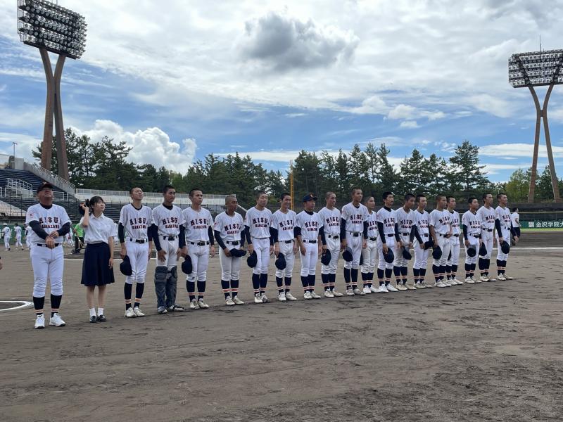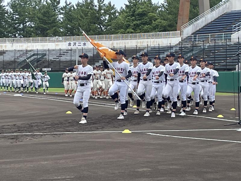 第105回全国高等学校野球選手権記念石川県大会が開幕し、大会6日目7月16日(日)県立野球場第3試合で飯田高校と対戦しました。3年生は人数が少ない中、チームを力強く牽引し多くの試練を乗り越えここまで来ました。応援していただいている方や支えてくれた家族に、全力でプレーする姿を見せ勝利を掴み取る準備をして迎えることができました。