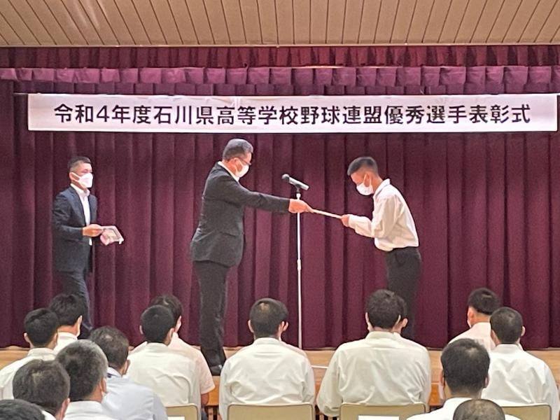 9月2日(金)令和4年度石川県高等学校野球連盟優秀選手表彰式が行われ、本校野球部元主将3年の谷﨑 幹太選手が大会優秀選手に選ばれました。高校野球の模範となる選手に贈られる名誉ある賞を受賞した谷﨑選手は「自分が信じて取り組み続けたことを評価していただけたことは大変嬉しく思います。また大会で悔しい思いはしましたが、二水高校野球部の発展にこのような形で貢献できて良かった。これからの学校生活も部活動で培ったことを大切にします。」と語りました。