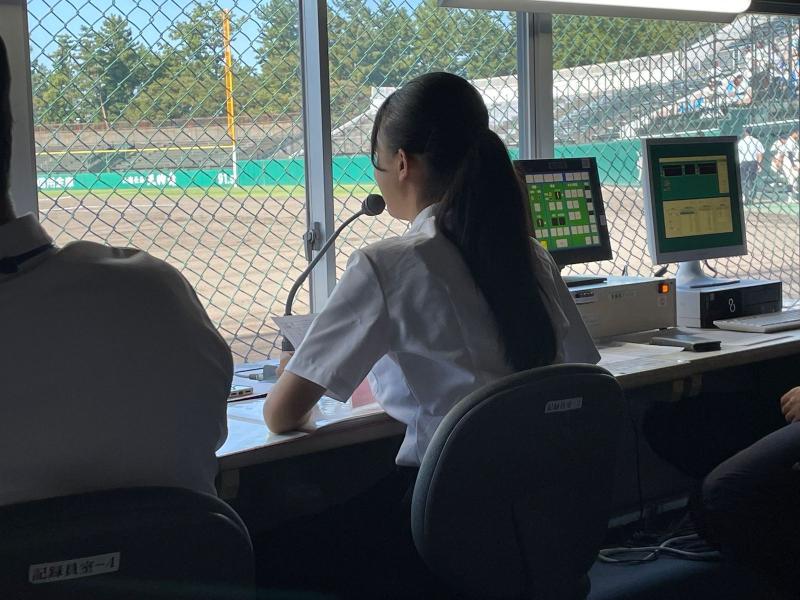 本校では選手と同じ高い志を持ち、選手と共に戦うマネージャーも活躍しています。引退した3年生マネージャーの立派な姿を見てきた1、2年マネージャーはその背中を追い越すべく日々チームや個人をマネジメントできるよう取り組んでいます。今大会も補助員として試合のアナウンスを2年生マネージャーが担当しました。公式戦での実践は初めてで緊張した面持ちはありましたが、堂々としたアナウンスが球場に流れました。これからさらに実践を積み力をつけていきます。その他にも大会中は、チケット売りや募金活動など裏方の仕事が様々あり、活躍できる場面がたくさんあります。