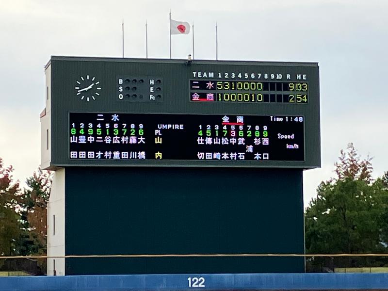 二水先発投手は6回を投げ2失点と金商打線を抑え込み、テンポ良く打たせて捕るピッチングで試合を有利に進めました。守備のミスで失点を許しましたが、終始ゾーンにコントロールする制球力で6回を投げ切りました。最終回は継投した投手がきっちり3人で打ち取り9ー2の7回コールドゲームで勝利し、トーナメント進出を決めました。