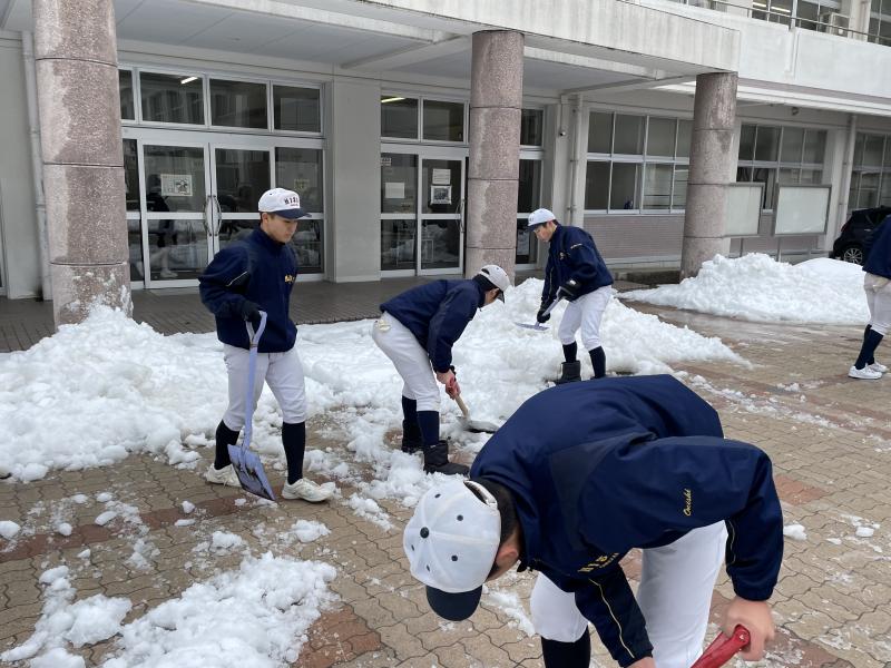 今年も12月に入り本格的に雪が降り積もりました。野球部では生徒や教職員が安全に歩行し安心して学校に登校できるよう生徒玄関や駐車場の雪かき、学校周辺の通路の確保を行っています。選手たちは自身のトレーニングも兼ねながら、ひたむきに取り組む姿は生徒や教職員、地域の方々からの感謝の言葉へと繋がっていきます。雪かき、清掃、挨拶運動など誰がやってもいいことに対して自ら率先して取り組むことができる個人・集団でありたいと考えます。仲間と協力したりコミュニケーションをとる中で達成感や充実感を味わい、他者からの「有難う」の一言が選手たちを強くしていきます。野球や勉強だけでなく、人として大切な要素を日々学んでいます。