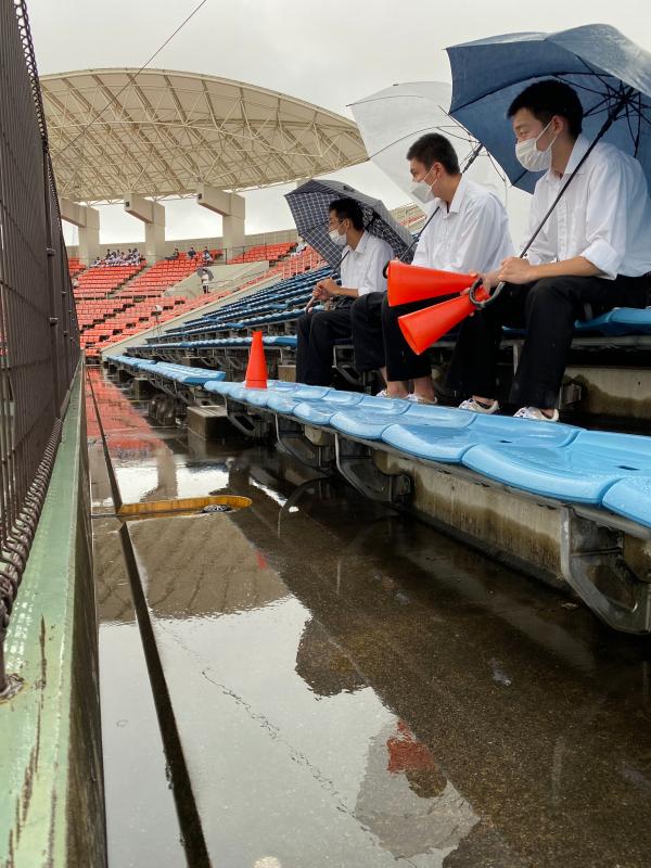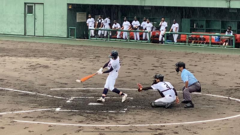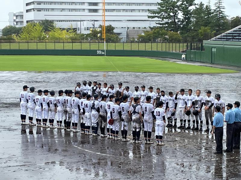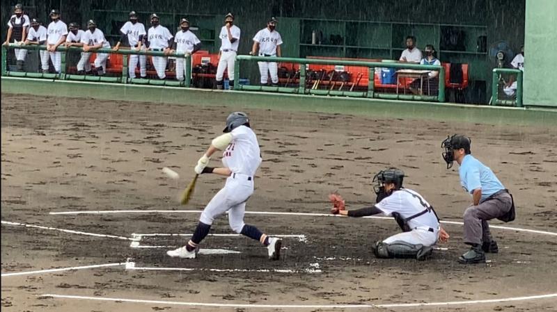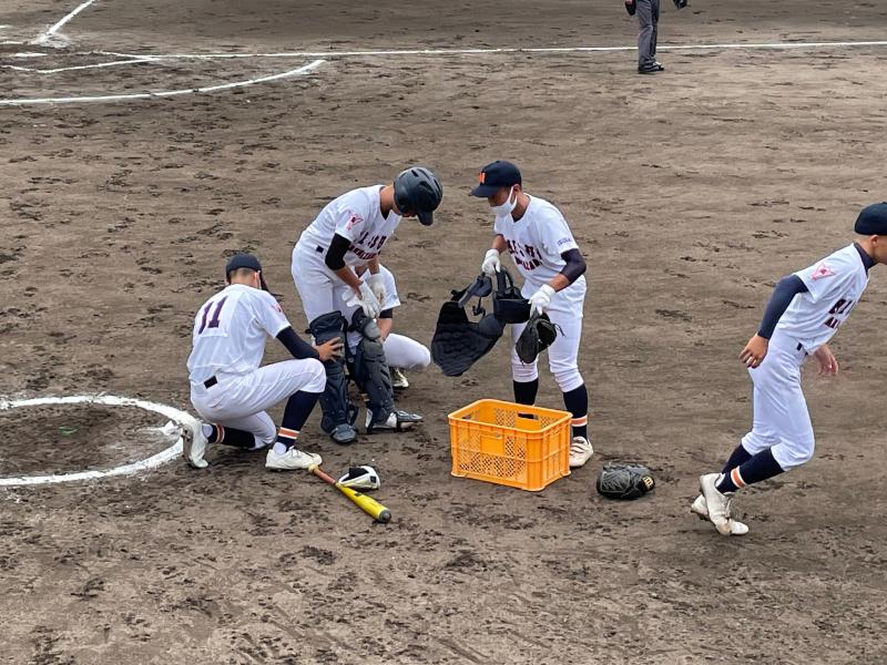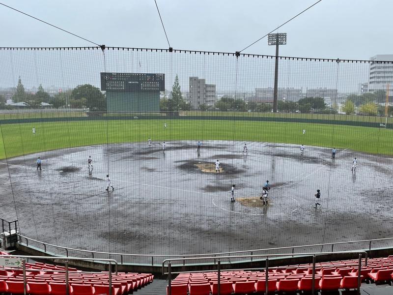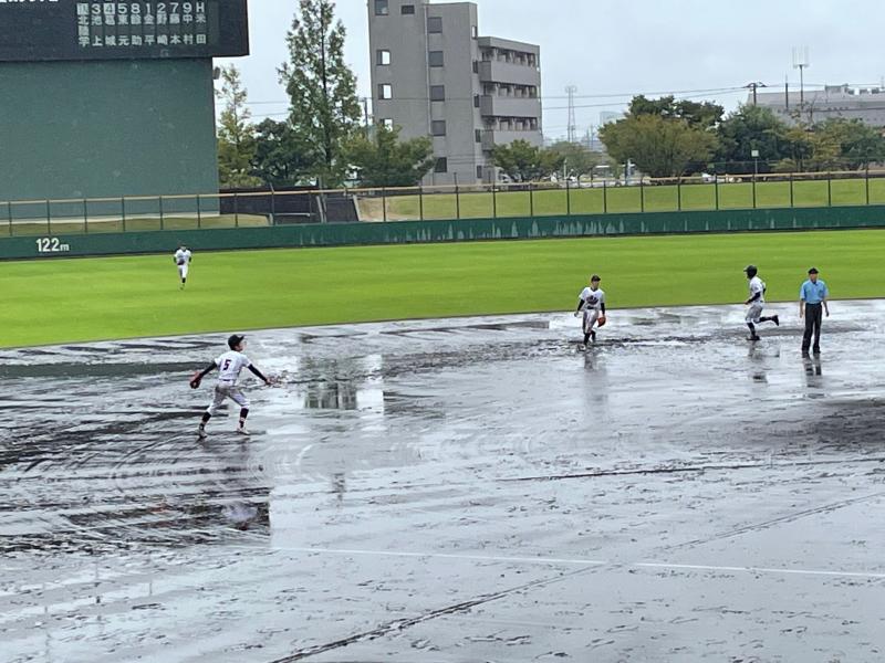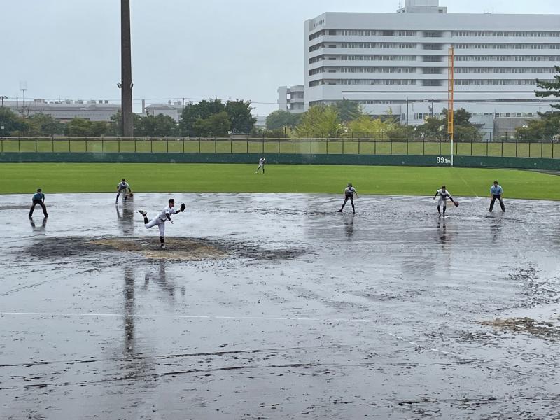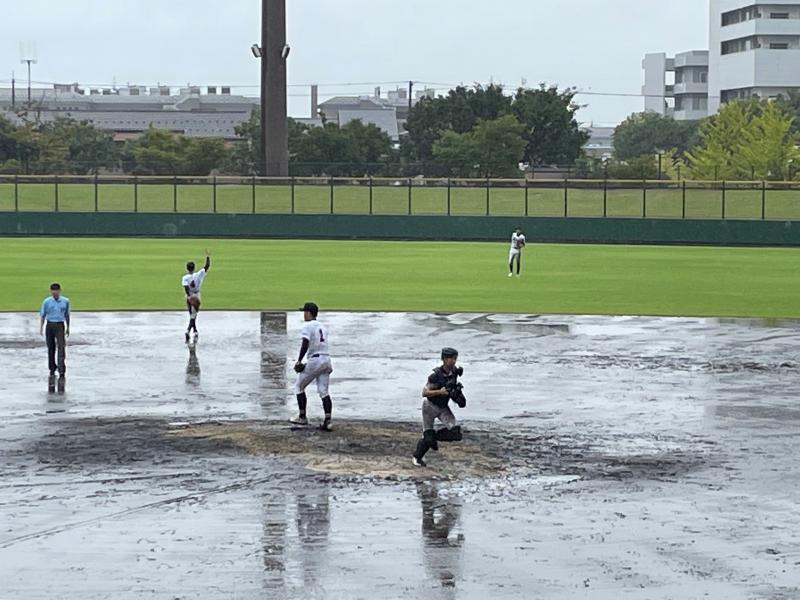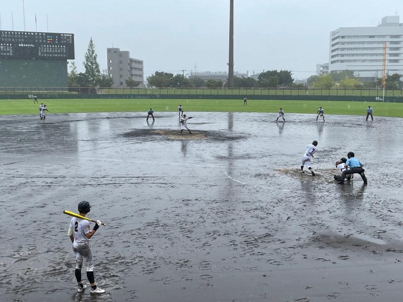 さらに勢いを増した雨が、グラウンド状態を悪化させ、水たまりで内野ゴロがまともに転がらないほどになり、一時中断をはさみながらも試合は続行されました。両チーム、いつ試合が大崩れしてもおかしくはない状況でしたが投手を中心に、二水野球部の気迫と集中力は試合終了まで持続することができました。試合の序盤・中盤・終盤に手堅く得点を奪った二水が、8回コールドゲームで見事勝利を勝ち取る結果となりました。
