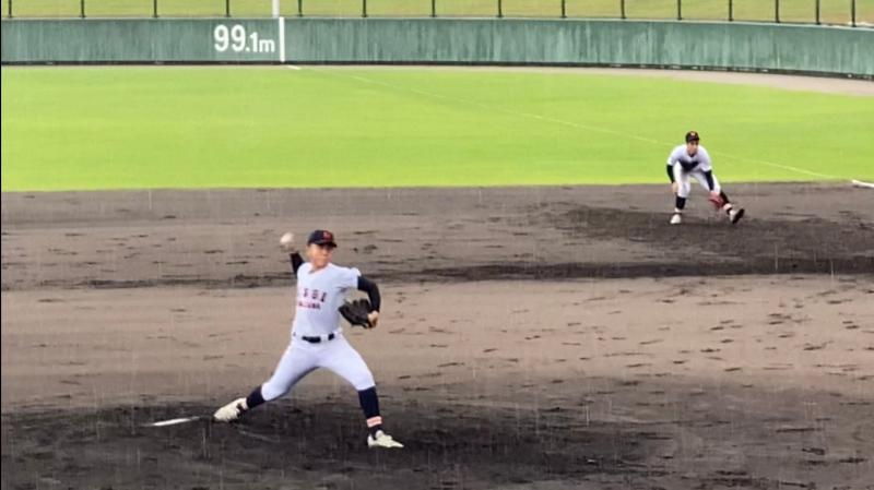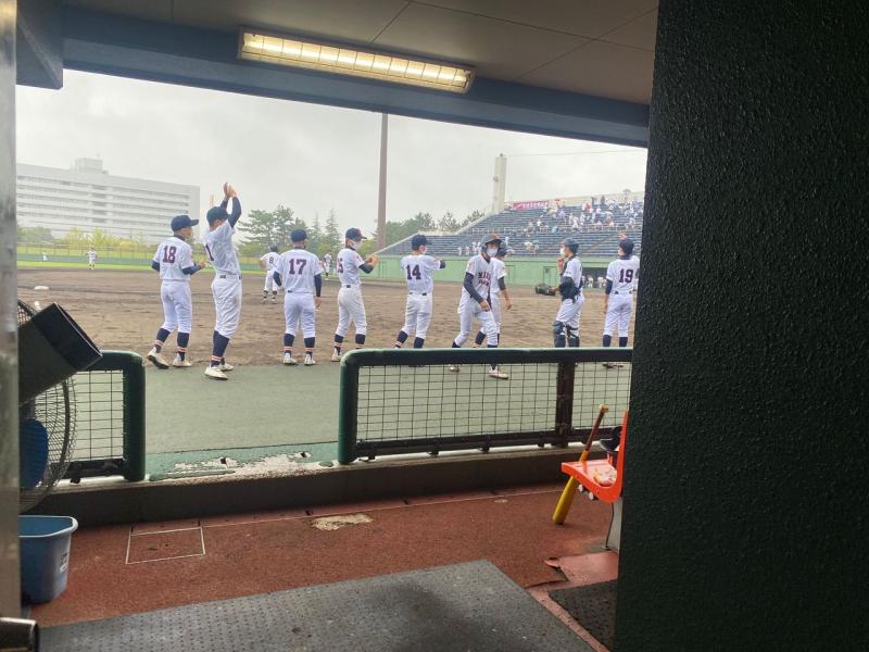 1回戦を5回コールドで勝ち抜き、迎えた2回戦は北陸学院高校でした。不安定な天候の中、初回から緊張感のある締まった試合が開始されました。何とか持ちこたえていた天候だが、2回から雨が降り出し両チームの投手が制球に苦しみ、悪天候という条件の中、粘り強く投げ切ることが勝敗のカギを握る試合展開となりました。