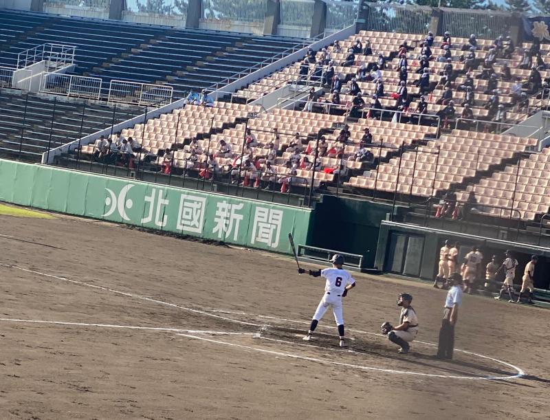 ここまでの2試合をコールドゲームで勝ち抜いた二水野球部は、ベスト8をかけて迎える3回戦の対戦校は遊学館高校でした。夏の大会で悔しい敗北を経験した新チームは、3年生の思いを受け継ぎ、大会で勝ち上がっていくと共に、大きく成長を遂げようとしています。新型コロナが終息していない現状ですが、大会を開催していただけたこと、思い切り野球に打ち込めること、応援に駆けつけてくれる家族や3年生、教職員の方々に感謝の意を込めながら試合に挑みました。