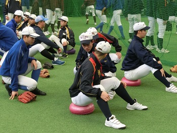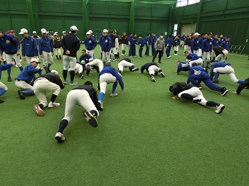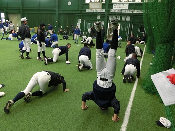 これを少しでも解消すべく、長めのストレッチや倒立、側転、ブリッジなど普段とは異なる項目をトレーニングメニューに加えました。案の定、こうした基礎的な動きに苦戦する選手が多く、新たな自分の課題に気付くことができています。表面的な野球技術の習得やがむしゃらな筋力トレーニングだけではなく、総合的な身体能力の向上のために努力を続けていきます。