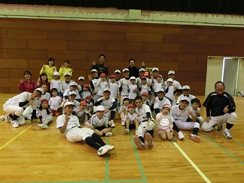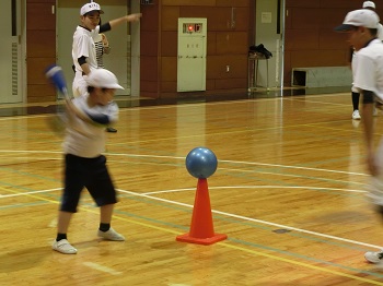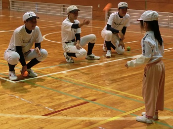 しかし、本校体育館に到着して一緒に『おにごっこ』をしてからは一気に打ち解け、その後は『やわらかボールを投げてみよう!』『ストラックアウトに挑戦!』『かっとばせ!ホームラン!』などの活動を楽しみました。バットを振ったりボールを投げたり、園児たちは高校生との野球遊びに夢中になっていました。
