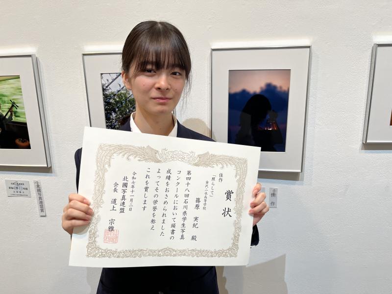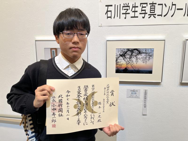 2年生の橋本一光君が北國新聞社社長賞、篠原美紀さんが佳作、1年生の橘仁子さんが佳作を受賞しました。