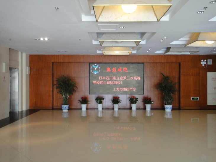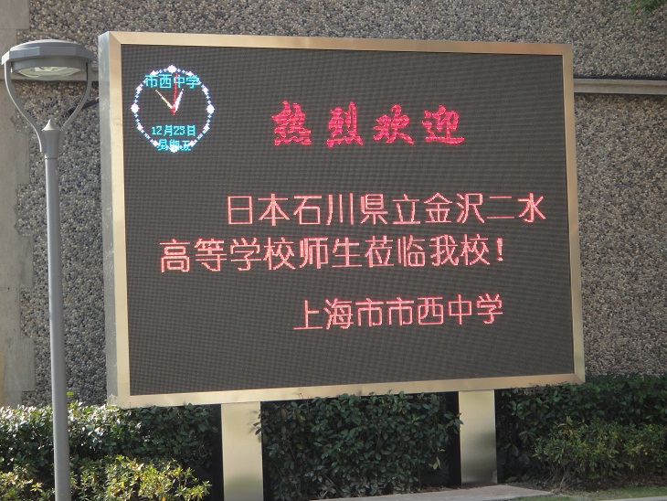 23年度上海交流事業12月23日(2日目-3) 2011年12月27日 11時01分 [管理] 市西中学に到着すると玄関に生徒と先生が待っていていくれました。SKYPEで何度も交流をしていますから、お互いすでに顔なじみです。すぐに打ち解け、学校に入ります。至る所に歓迎の文字が見られます。外にも電光掲示板があります。昨年は工事中でしたが今年はほぼ完成しており、大学のような雰囲気があります。上海で有名な進学校です。生徒もしっかりしていました。生徒はそれぞれ自信に満ちあふれていました。