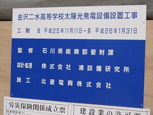 太陽光発電設備を工事中です。 2013年12月2日 06時54分 このほど、本校管理棟(職員室などのある建屋)屋上に太陽光発電設備を設置することとなり、先月から工事が始まりました。発電規模は20キロワット。来年1月末までの工期を見込んでいます。ご来校の方には、しばらくの間、ご不便をお掛けしますが、ご容赦ください。