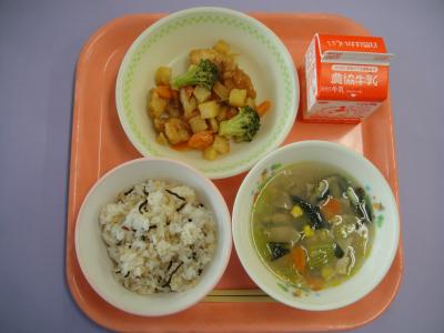 ★じゃこんぶうめごはんは給食で初めて出た新メニューです!ごはんに炒ったしらす・ごま・かつお節と塩昆布と乾燥カリカリ梅を混ぜ込んで作っています。梅がさっぱりしていておいしい!と児童からとても大好評でした。