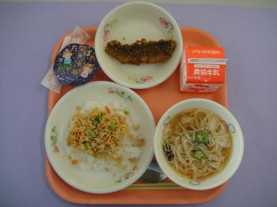★今日は七夕給食です。天の川に見立てたそうめんが入った七夕汁や、星型のゼリーでした。今日は特に暑かったので、冷たいそうめんに大喜びでした!3色ゼリーも「この色は何味だろう?」と大盛り上がりでした!