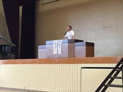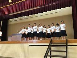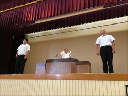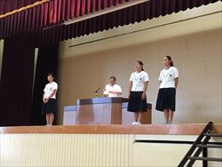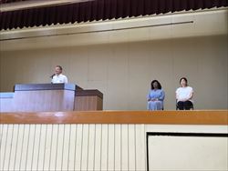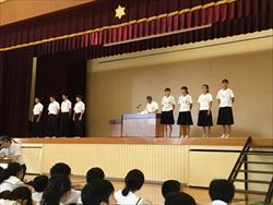 陸上部、柔道部、水泳部、バトントワリング部から県体などの大会の成績を報告しました。北信越大会では、さらなる活躍を期待します。
