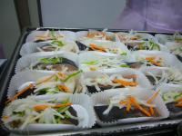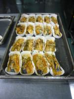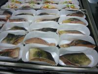 鮭をカップに入れます 上から野菜をのせます みそだれをかけます 焼き上がりました 今日の給食
