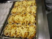 ミートソースに豆腐を入れます カップに具を詰めます 上からとろけるチーズをたっぷり こんがり焼きます 今日の給食です
