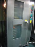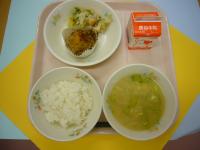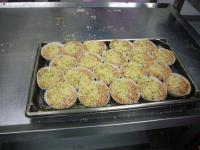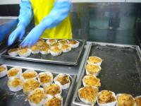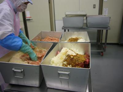肉と野菜調味料をこね合わせます→種をカップに入れパン粉を振ります→スチームコンベクションで焼きます→出来上がり。クラスの食缶に配食します。