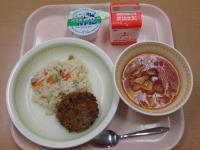 「五目ピラフ、ヤーコン入り焼きメンチ、野々市野菜のミネストローネ、牛乳、ヨーグルト」です。