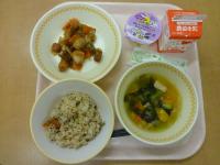献立は「五目ごはん・豚肉とさといもの照り和え・お月見汁・お月見ゼリー・牛乳」です。