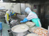 天ぷら衣をつけて揚げます 1人2個ずつに数を数えます 今日の給食です