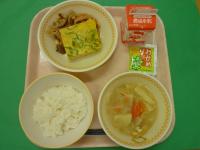 2022年4月27日 15時23分今日の給食は「ごはん・千草焼き・江戸っ子煮・揚げとじゃがいものみそ汁・ふりかけ・牛乳」です。