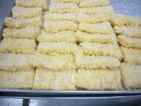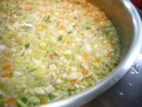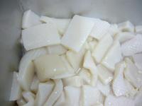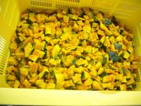 かぼちゃは小さくカットして茹でる 鶏野菜汁・・ねぎは大きめ 今日の給食