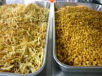 今日は大豆と小魚とごぼうのごまからめでした。大豆は前日から水に漬けて戻し、片栗粉をまぶして油で揚げます。