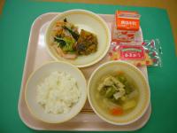鯖の味噌煮 新じゃがいも たけのこ スナップエンドウ 今日の給食