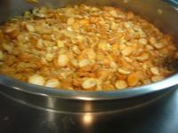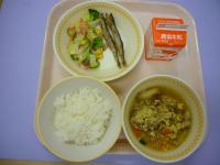 2021年3月16日 13時16分今日は油麩の卵とじです。給食ではよく登場します。乾燥している麩は水で戻さないと調味料の味が染み込みにくいですが、油麩は油で揚げてあるので、味が染み込みやすく煮物にしてもコクがあっておいしいです。