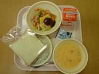今日の給食は、「食パン・ポークピカタ・アーモンドサラダ・にんじんポタージュ・ブルーベリージャム・牛乳」です。