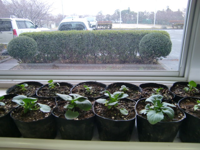 の植物の苗。これは「ビオラ」の苗です。校務員さんが育てて