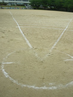 前日に,頑張って引いたソフトボール投げのラインが,朝の雨で消えてしまい,1時間目にまた,引き直したという写真です・・・。