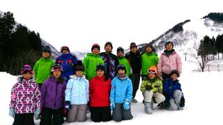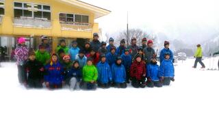 自然教室二日目は、雪&小雨の中、グループごとに滑りました。Aグループは、中学生に先導してもらいながら、一緒に滑りました。最後は、ゴンドラで上まで行き、林道コースではないコースも滑ることができました。