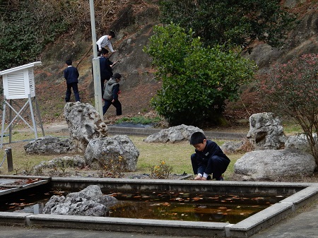昼休みの様子を見に行くと、低学年のみなさんは寒空の中ではありますが、元気に『九十九っ子の森』で遊んでいました。