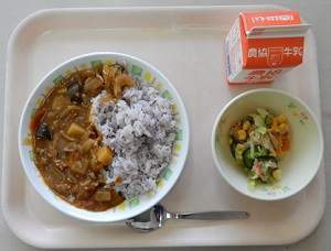 ビーフカレーライス ふくじん漬け シーチキンサラダ 牛乳