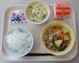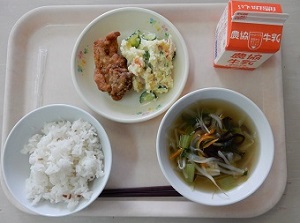 2015年9月30日 14時37分うめごはん 牛乳 きたあかりのポテトサラダ 五目スープ