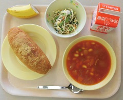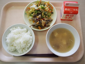 今日の給食では白インゲンではなく、石川県産の大豆と