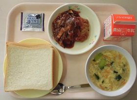 食パン 煮込みハンバーグ コーンクリームスープ