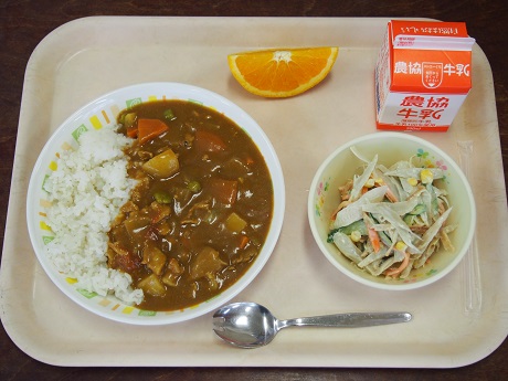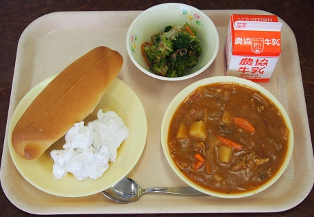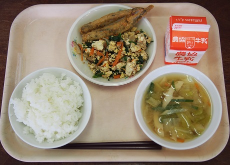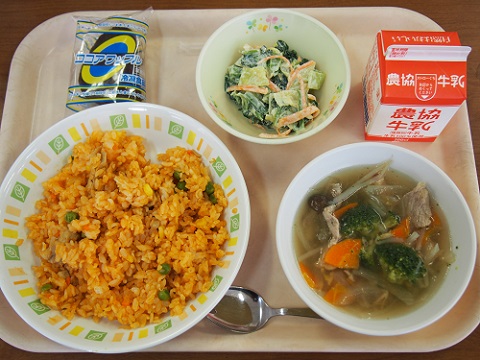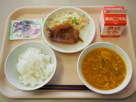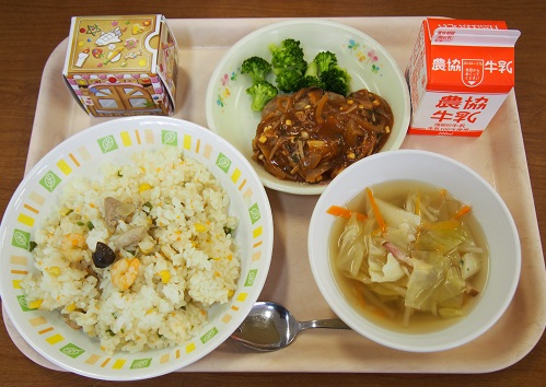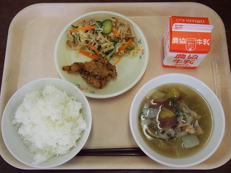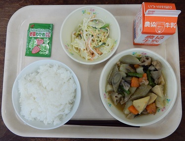 今日の給食の雑煮では、紅白のもちがはいっていました。